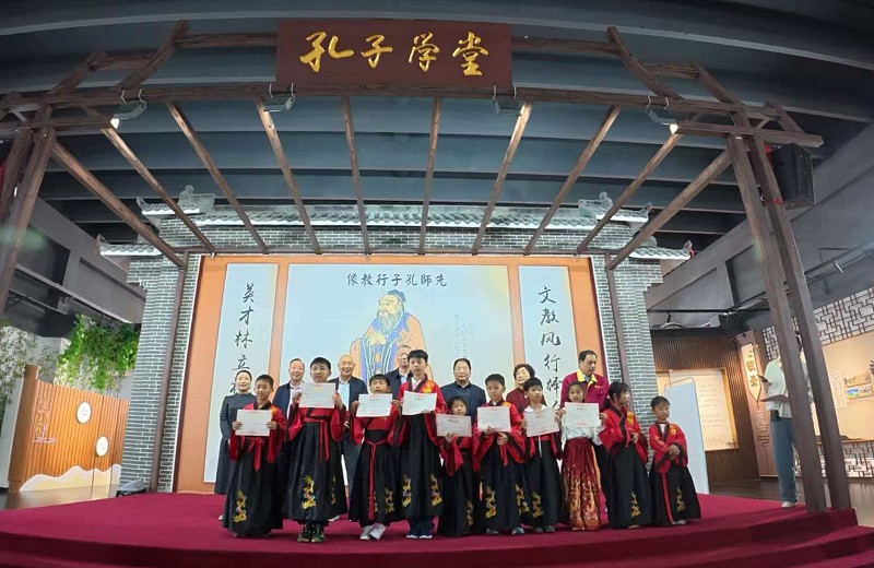 之后,牡丹区关工委国学教育推广中心主任、家长学校校长王梅云为参加《论语》学习的孩子颁发证书,并赠送《父母规》读本和《学生立志文》。她带领全体家长和孩子齐声朗读《学生立志文》,铿锵有力的诵读声响彻学堂,孩子们在庄严的仪式中坚定了立志向学的信念。王梅云校长鼓励大家坚持参与国学学习,在接受儒家文化熏陶、修身养性的道路上不断前行。全体人员在孔子学堂合影留念,定格下这充满文化气息的美好时刻。